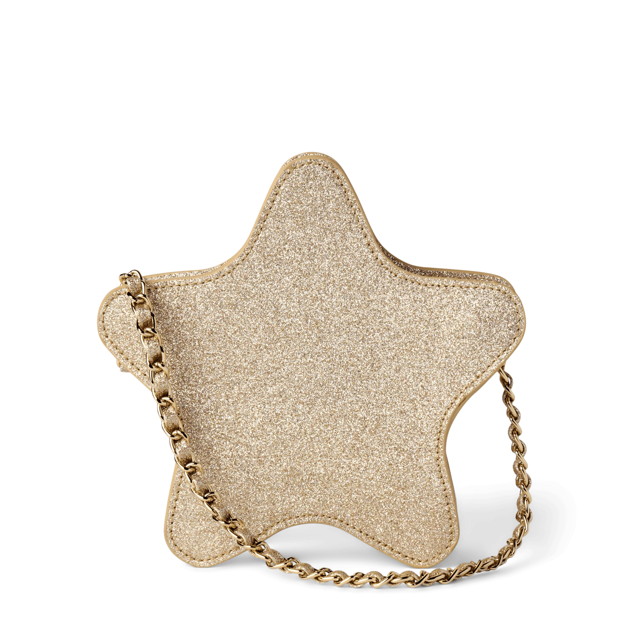 - A golden star-shaped purse with golden-metal chain strap and zip closure