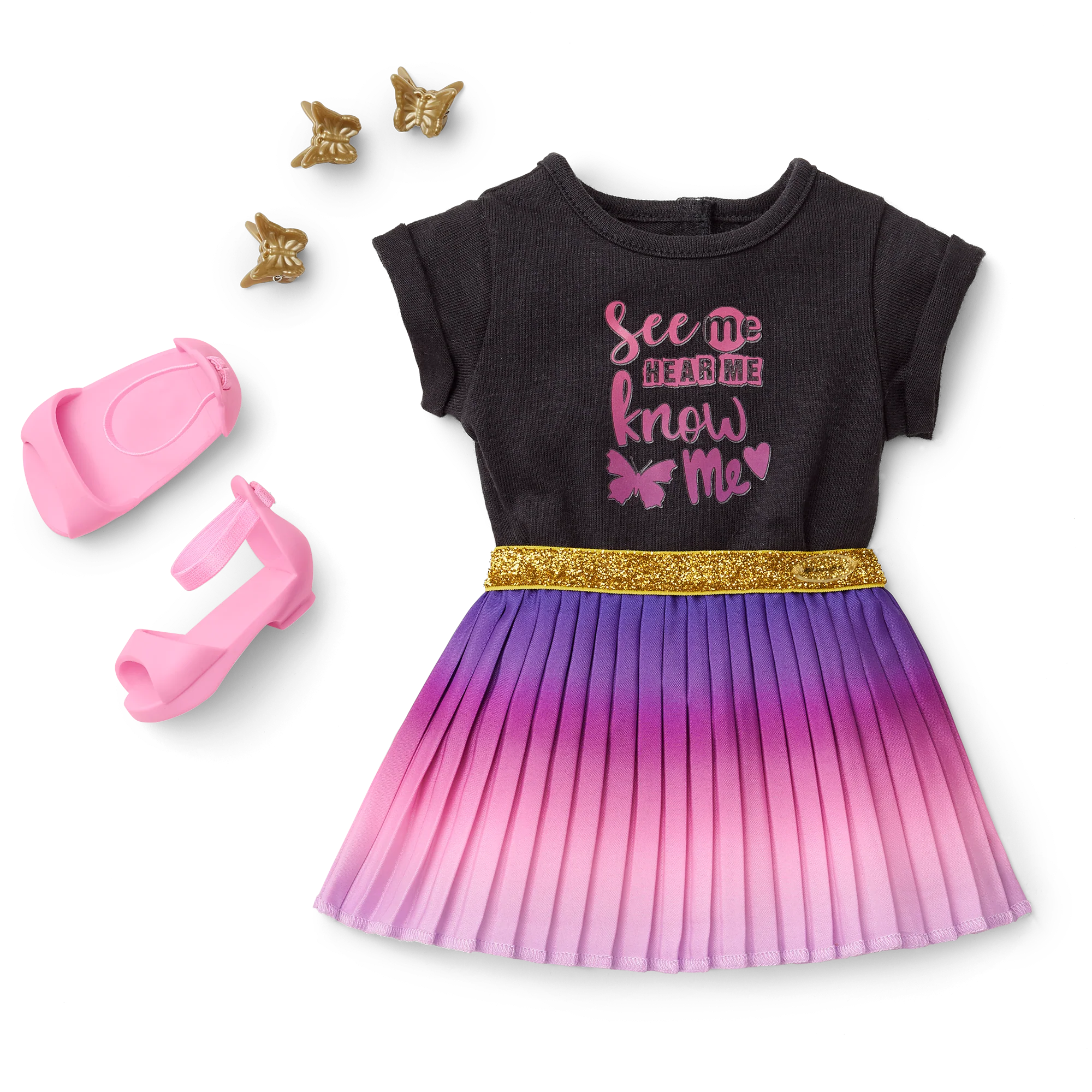 - A pleated skirt with a pink-and-purple ombre print and a glittery elastic waistband
